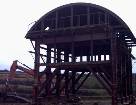 西安襯砌臺(tái)車(chē)主要用于中長(zhǎng)隧道施工中,對(duì)施工進(jìn)度、砼表面質(zhì)量要求較高。此類(lèi)襯砌臺(tái)車(chē)設(shè)計(jì)為整體鋼模板、液壓油缸脫立模,施工中靠絲桿千斤支撐,電動(dòng)減速機(jī)自動(dòng)行走或油缸步進(jìn)式自動(dòng)行走,全部采用砼輸送泵車(chē)灌注。大部分襯砌臺(tái)車(chē)為該類(lèi)臺(tái)車(chē)。設(shè)計(jì)該類(lèi)襯砌臺(tái)車(chē)時(shí),在滿(mǎn)足通過(guò)凈空要求的情況下,應(yīng)考慮門(mén)架內(nèi)側(cè)斜支撐下部安裝位置,盡可能靠近立柱下部,使之受力最好。門(mén)架橫梁應(yīng)足夠高,常規(guī)鐵路隧道不小于400mm,公路隧道不小于5500mm。模板端面與門(mén)架間的調(diào)整最小距離不小于250mm,否則將造成前后襯砌段搭接困難。